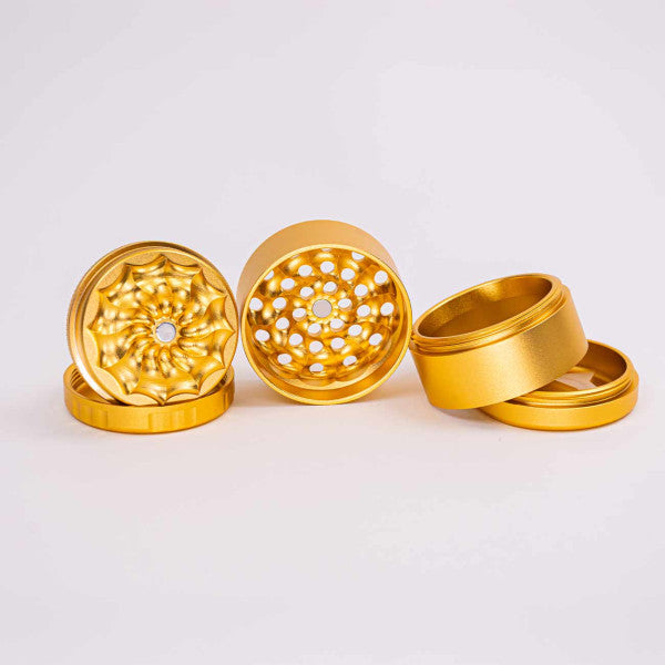 The 5-piece FLOWER grinder from Black Leaf® – like the Masher – doesn't have grinding teeth. Instead, it grinds the material particularly evenly using pressure in its flower-shaped wave pattern. This high-quality aluminum grinder features a larger storage chamber directly under the lid, allowing the upper part of the grinder to exert sufficient pressure for effective grinding.